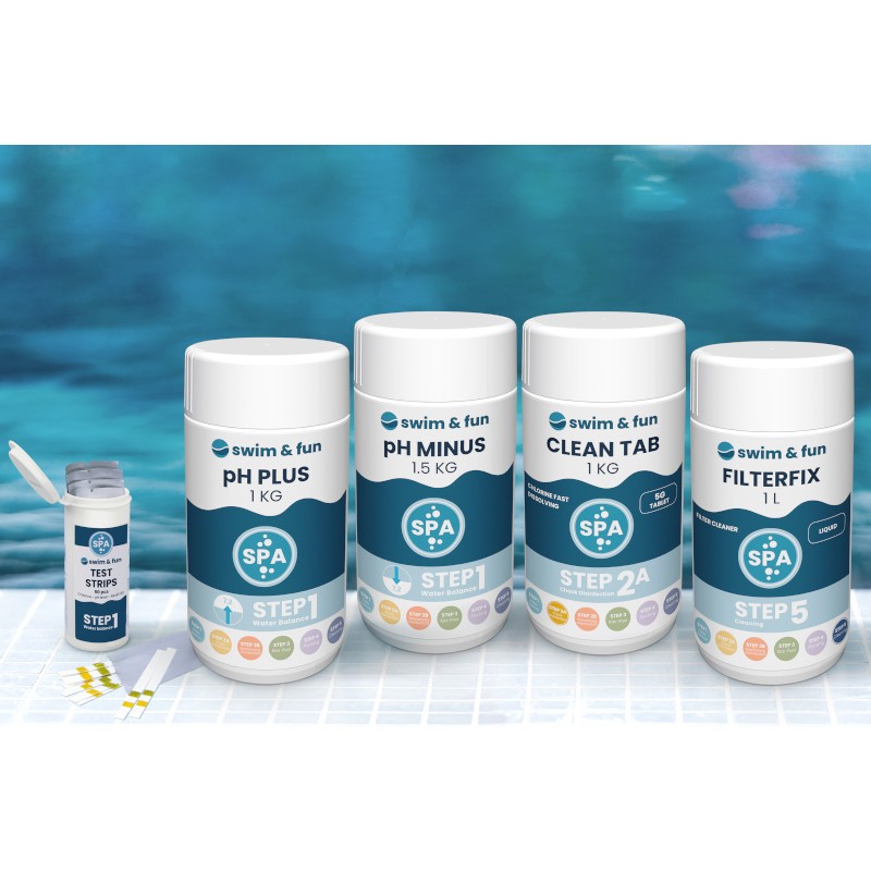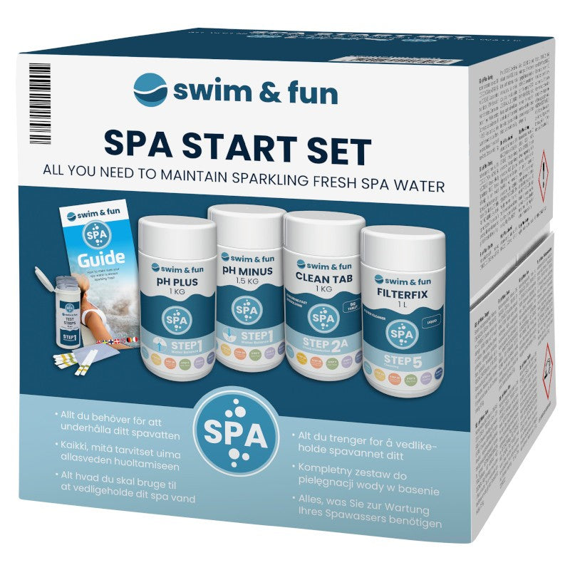 Spa Start-Set innehåller CleanTab för desinfektion av vattnet och remsor för enkel testning av pH- och klornivåer. pH-Plus och pH-Minus används för att justera pH-nivån. Filterfix för effektiv rengöring av spa-filtret. Innehåller en tydlig och informativ guide. "Med ett Spa Start Set får du garanterat en bra start. Setet innehåller alla skötselprodukter som behövs för att hålla vattnet i spabadet rent och inbjudande, samt en tydlig och informativ guide."